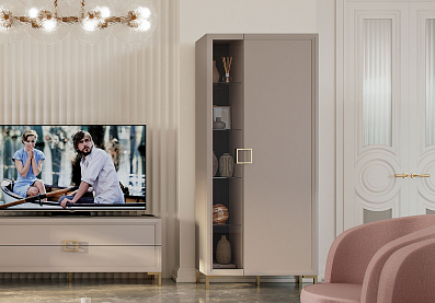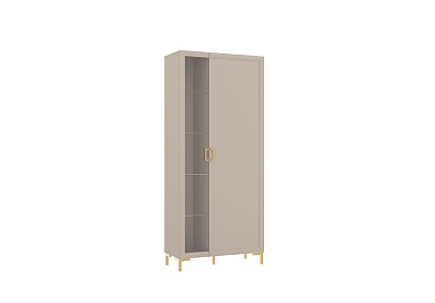- Внутреннее наполнение: 4 стеклополки 6 мм за стеклянным фасадом, и 4 полки ЛДСП 16 мм — за глухим;