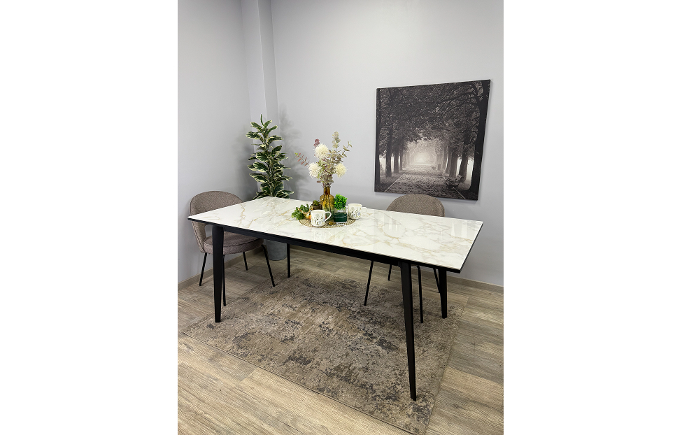 Стол обеденный Дега раздвижной KR1400 – стильный и практичный стол с керамической столешницей, которая отличается высокой прочностью и долговечностью. Каркас выполнен из стального профиля и окрашен в черный цвет, который гармонично сочетается с глянцевой поверхностью керамики.